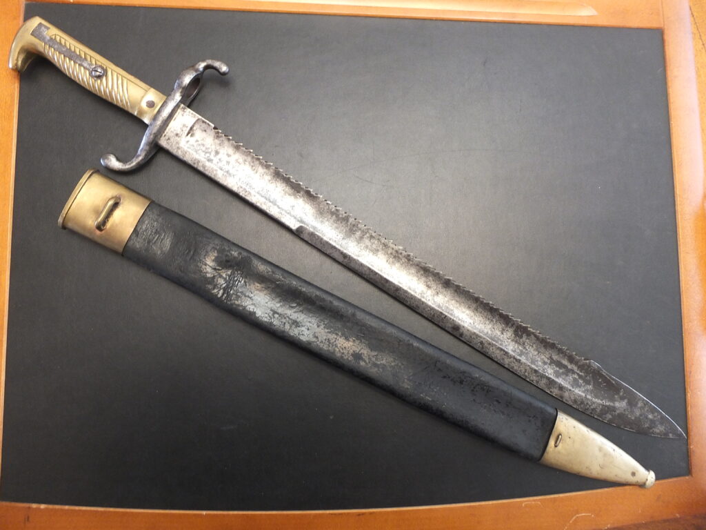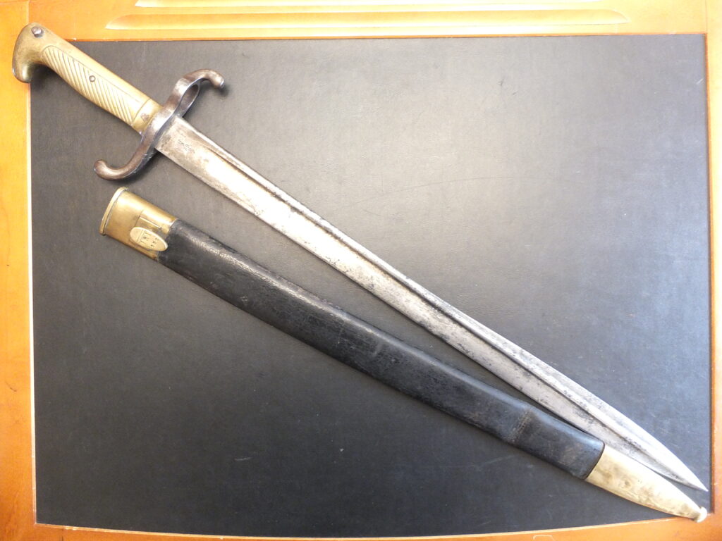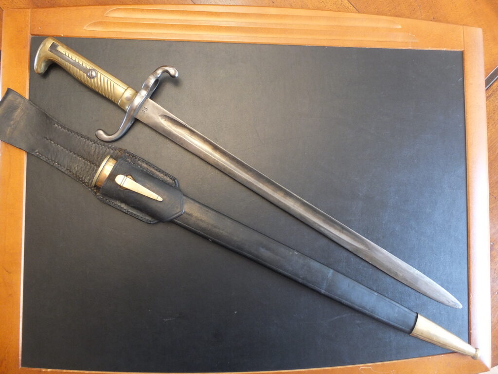 Cette rare baïonnette a été utilisée en Alsace-Lorraine lorsque ce territoire est passé sous domination prussienne après la guerre de 1870. Ce modèle adopté en 1876 témoigne par certains aspects, de l’influence française et de sa forte inspiration de la lame de la baïonnette Chassepot. La poignée de type 1871, ainsi que la croisière, sont entièrement en acier. La face striée comporte 16 cordons. Le ressort extérieur est plat, à droite et est tenu par une vis. La face lisse, à gauche, porte le bouton-poussoir. La rainure en T mesure 33mm. La croisière en S se termine par un retour vers l’avant et un quillon à extrémité tournée vers l’arrière. La lame, de type yatagan à double courbure, tranchant et contre-tranchant sur 180mm, présente des pans creux de chaque côté sur 415mm. Elle s’inspire fortement de la lame du Chassepot. Le fourreau est en cuir à garnitures acier. Il présente une chape à long bouton de suspension, fixée très bas. La cuvette est tenue par une vis. La bouterolle se termine en arrondi sans bouton terminal. Les garnitures présentent deux traits transversaux.