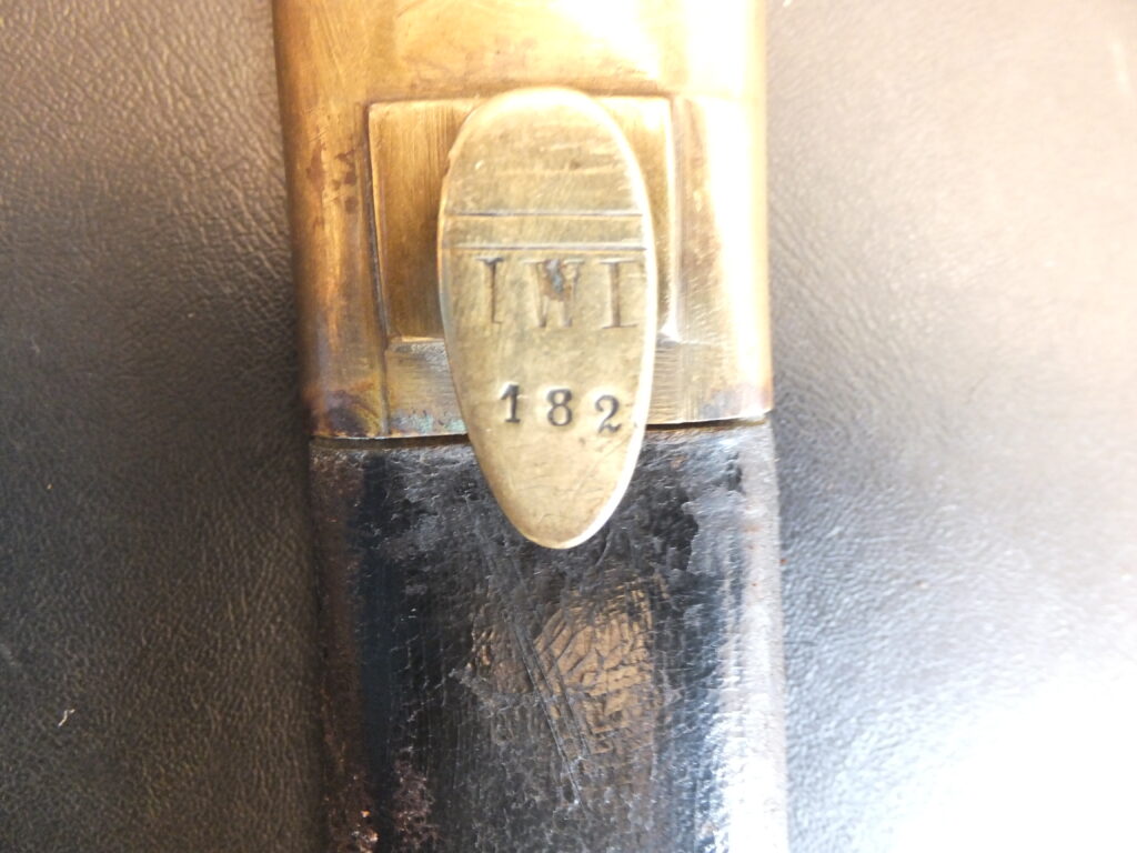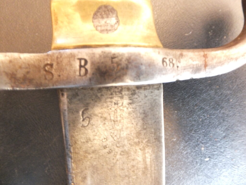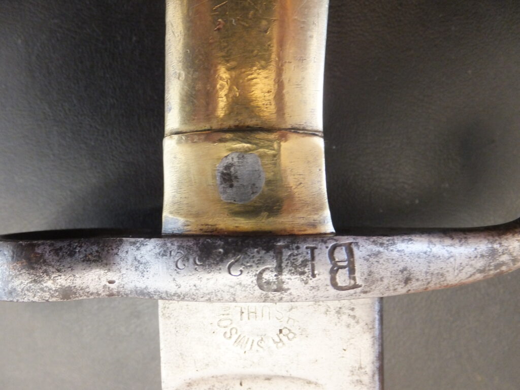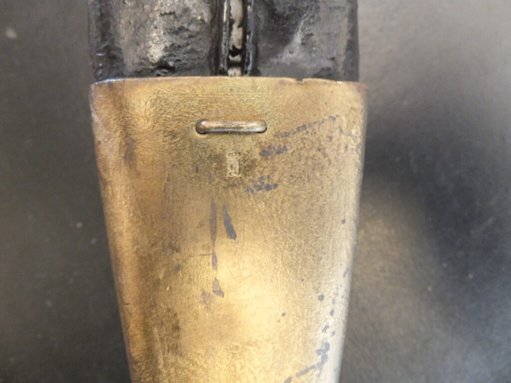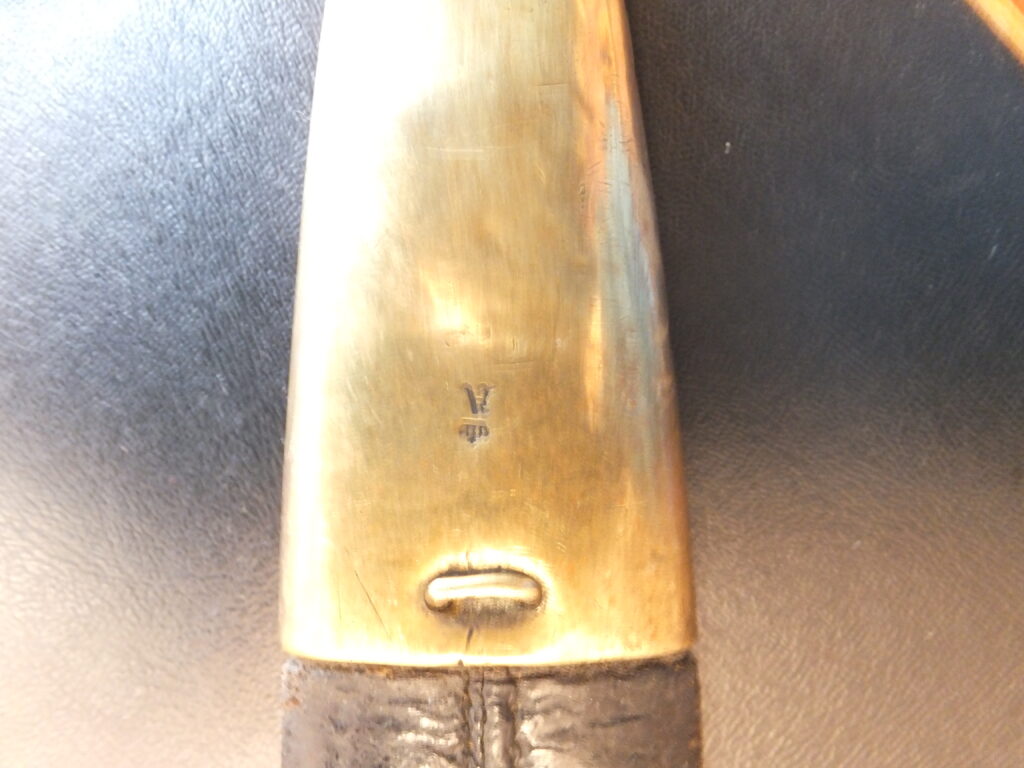 Cette baïonnette de capture présente à la fois les marquages autrichiens d’origine mais également prussiens distinctifs à savoir un poinçon constitué d’une lettre gothique sous couronne apposé sur la partie arrière du coude au départ de la lame et parfois un marquage régimentaire.