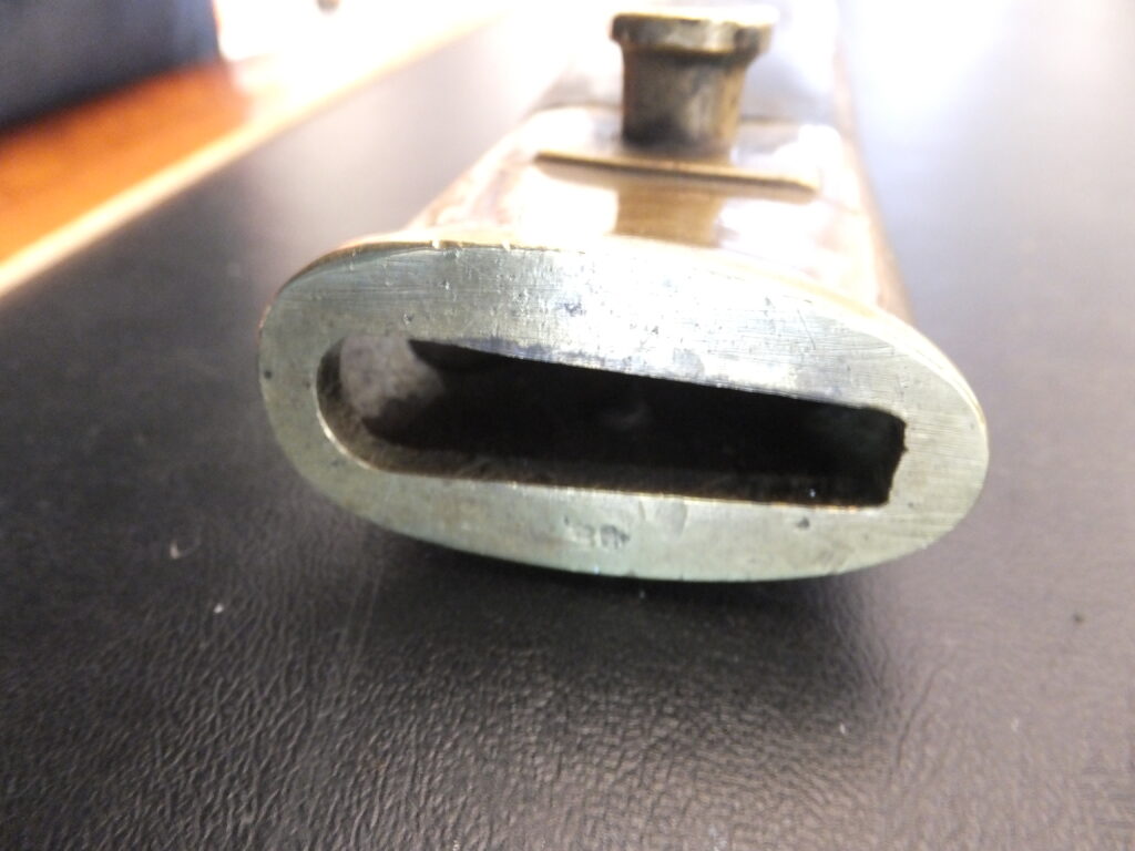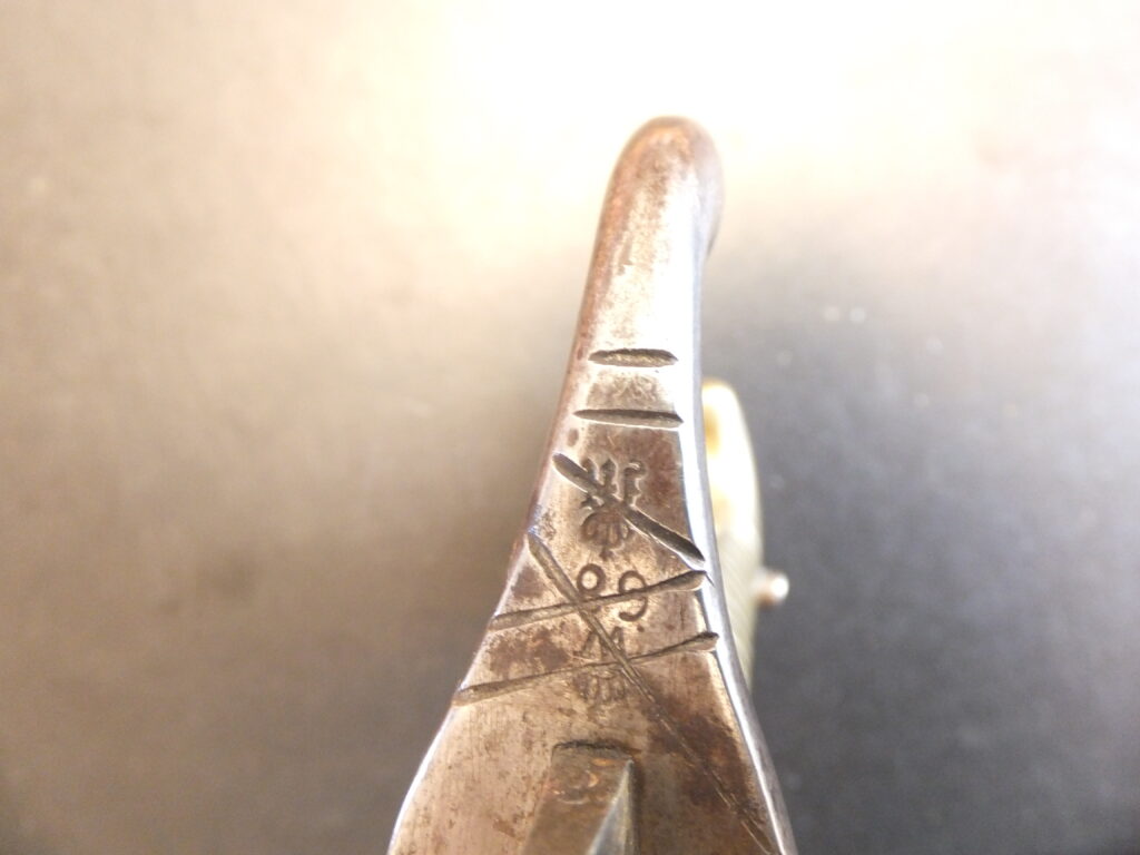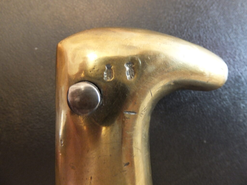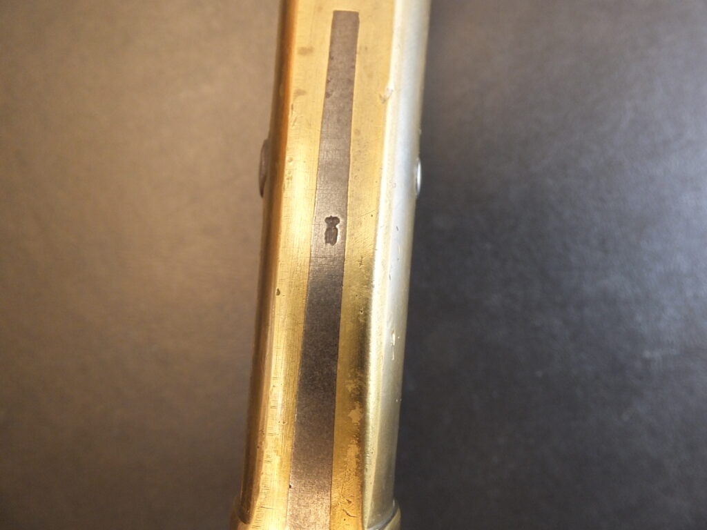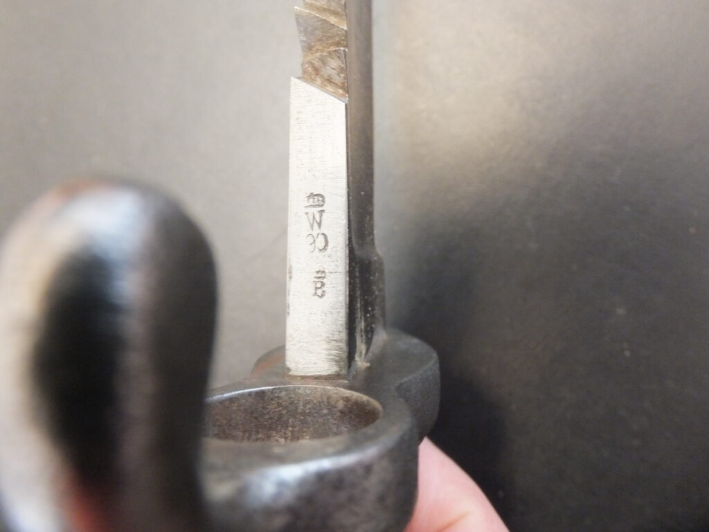 Cette baïonnette de capture présente à la fois les marquages autrichiens d’origine mais également prussiens distinctifs à savoir un poinçon constitué d’une lettre gothique sous couronne apposé sur la partie arrière du coude au départ de la lame et parfois un marquage régimentaire.
