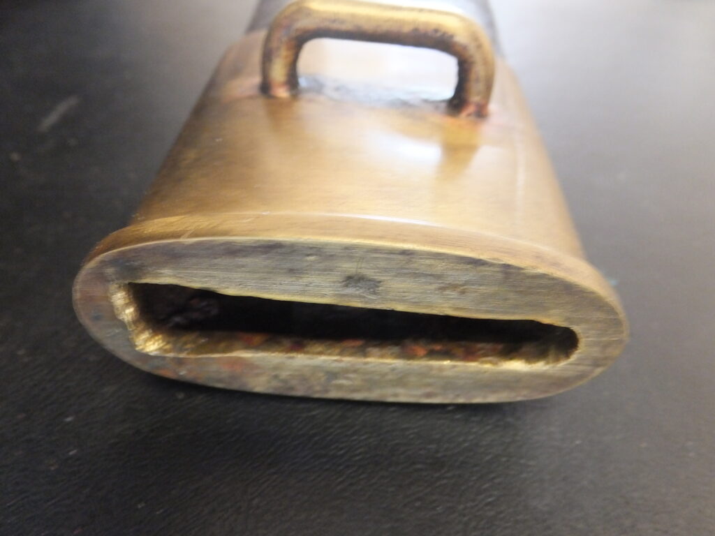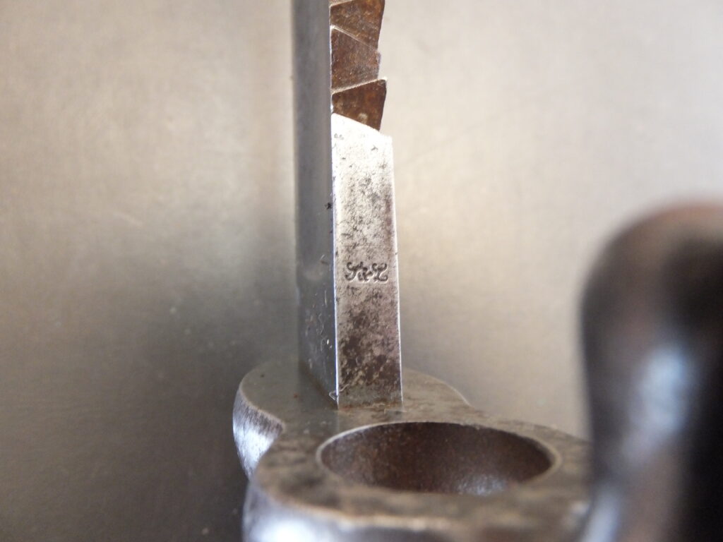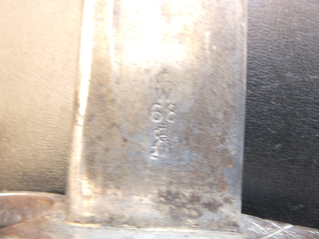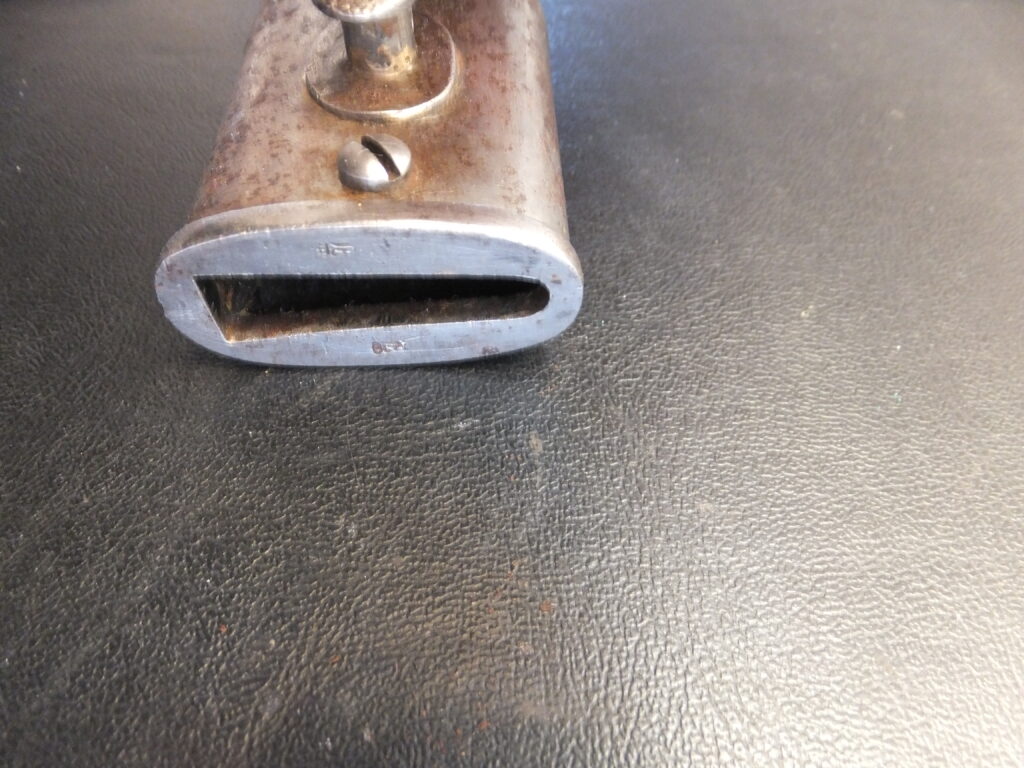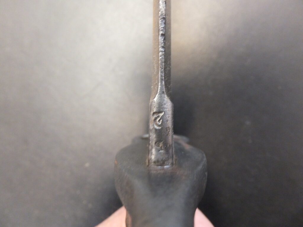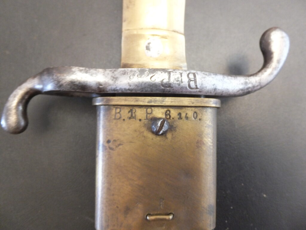 Baïonnette à douille à simple fente pour tenon dessous. Elle présente un bourrelet à ponter à l’arrière. La virole est large et son mouvement est très limité par étourneau interne. La lame comporte un arrêtoir à sa base. elle st robuste et commence par une section rectangulaire pour terminer par section hexagonale aplatie à deux tranchnt symétriques et méplat médian. Le tlon porte un poinçon consitué d’un cercle surmonté d’une petite croix et un nombre à deux chiffres (ici 47).