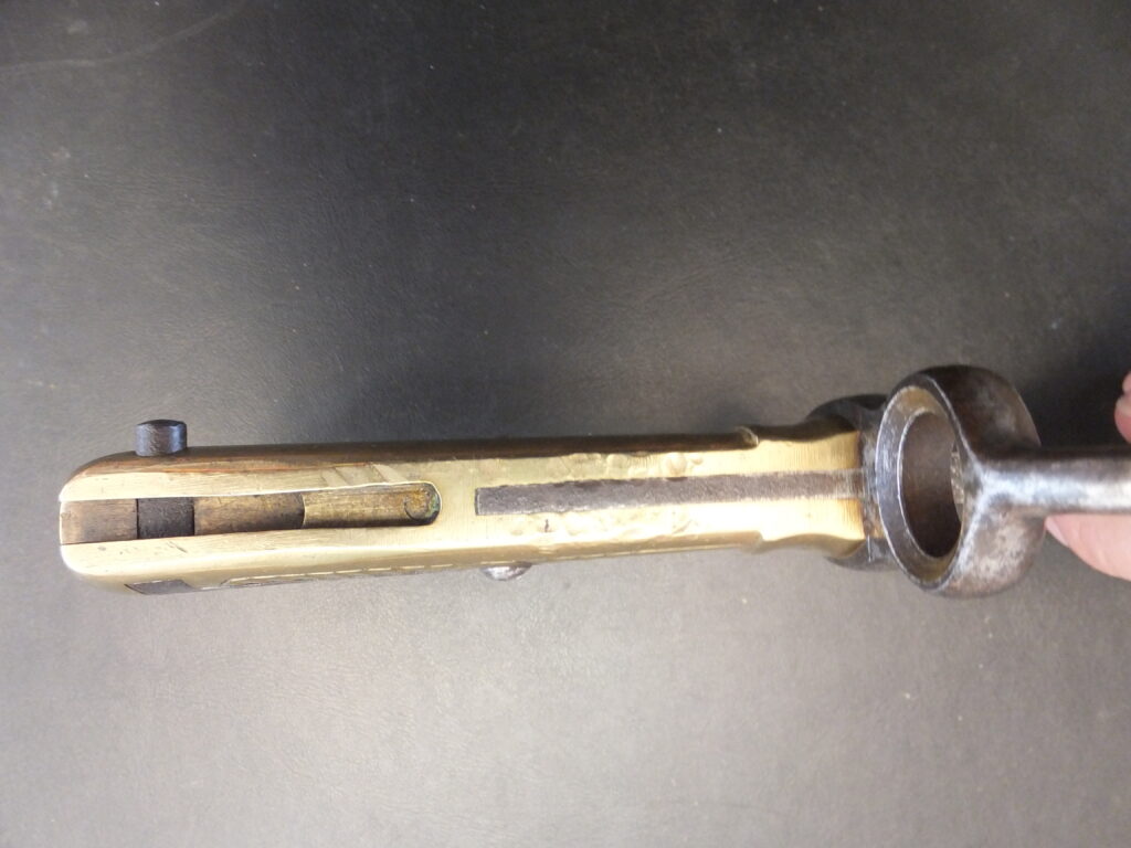 Baïonnette composée d’une poignée et croisière en laiton. La croisière à deux quillons droits terminés en boule. La poignée est canellée d’un côté (9 cordons) et avec une rainrure de 87mm en forme de queue d’aronde au fond el aquelle se trouve une mortaise oblique terminée par une pièce en fer qui sert à verrouiller le ressort porté par l’ergot du canon del’arme à feu de l’autre. Le talon porte une bouton de rivure entouré d’une prohéminence circulaire. La lame est droite, double tranchant et à large gouttière centrale de 352mm, carrée aux deux extrémités. Elle comporte au talon la tête couronnée, poinçon de Gebrüder Weyersberg Solingen. Le fourreau est en cuir noir à garnitures laitons et à ponter. Les garnitures sont bordées d’un bourrelet typique du würtemberg.