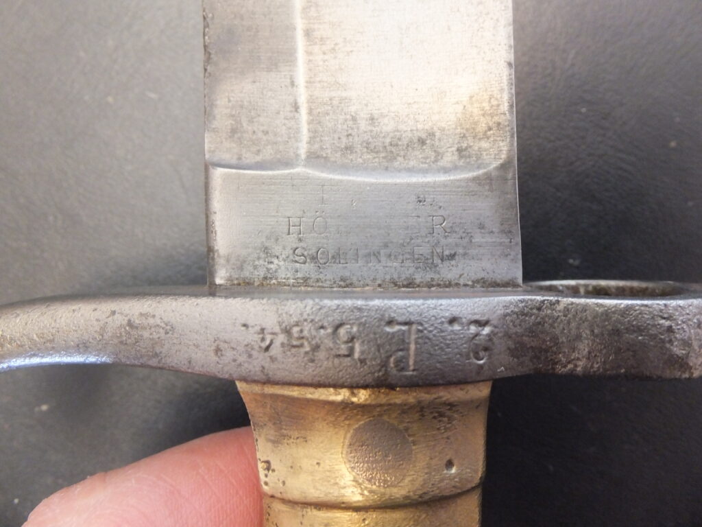 Baïonnette autrichienne modèle 1854 réutilisées . Matricule autrichien 5.6.154; Poinçon d’acceptation prussien. Les marquages K2 : 12 et IL21:533 marquent qu’elle a été dans le Kassler Fundus.