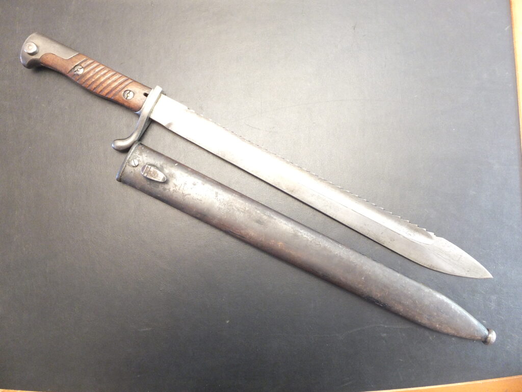 L’utilisation de baïonnettes à dents de scie par l’armée allemande a engendré une large condamnation par ses opposants qui ont prétendu qu’elles contrevenaient à la convention de Genève. Ces baïonnettes ont été ainsi citées dans la propagande de l’époque comme témoignage de l’horreur et de la barbarie allemande, alors que les Britanniques, les Belges avaient également des baïonnettes à dents de scie et que les Suisses continuèrent d’en fabriquer après la guerre. Leurs utilisation en tant qu’outil fût totalement ignorée et l’accent fût mis sur les terribles blessures qu’elles auraient causées. Si tant est qu’elles furent craintes par les opposants, elles le furent encore plus par les troupes qui portaient ces baïonnettes, au regard de ce qu’ils risquaient s’ils étaient capturés avec de telles baïonnettes. Ainsi, en 1917 était ordonné de meuler les scies pour les troupes se trouvant en première ligne. Ces transformations ont été réalisées en arsenal avec apposition d’un poinçon de contrôle (RC) sur le début de la lame. Certains exemplaires furent modifiés par les armureries régimentaires à proximité du front, enfin, par des entreprises privées, pour effectuer cette modification sur les nouvelles fabrications.