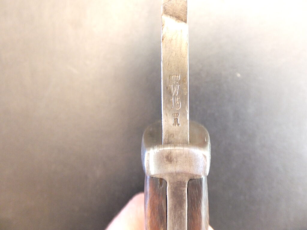- La date de fabrication (2 chiffres) sous une lettre sous couronne (indiquant le royaume dont est issue la baïonnette, la lettre correspondant au souverain du royaume), sont situées sur le dos de la lame à proximité de la croisière.