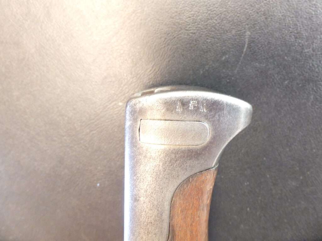 On ne dispose pas d’information à propos de cette baïonnette très rare. Sa poignée présente un pommeau qui rappelle celui du modèle 98-05 mais il est constitué de 2 parties brasées de part et d’autre de la soie. Les plaquettes en bois, maintenues par deux vis et ornée de 8 stries obliques, sont rectilignes et ne reprennent pas le galbe des plaquettes 98/05. le pommeau est encastré dans la soie puis soudé. La croisière, à quillon tourbée vers la poignée, présente une bague à double diamètre ouverte déportée vers l’arrière. La lame est manifestement de type 98-05 bien que moins longue, , un peu moins large et moins épaisse. Comme les lames ersatz, elle ne présente pas de marquage de fabricant au talon, mais uniquement une lettre gothique sous couronne au dos de la lame. Le fourreau est de type ersatz.
