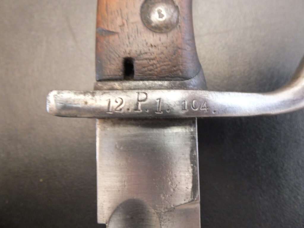 Baïonnette S. 98/05 n.A. fabricant Waffenfabrik Mauser-A.G. Oberndorf A-G W15, marquage Ldst.XIX.11.4.K.1 (Armeekorps XIX, Landstrum-infanterieBataillon 11, Kompanie 4, Waffe 1)