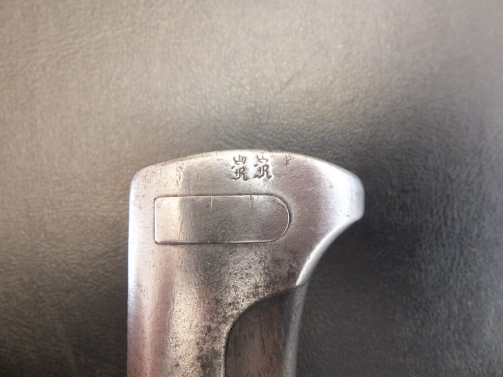 • La date de fabrication (2 chiffres) sous une lettre sous couronne (indiquant le royaume dont est issue la baïonnette, la lettre correspondant au souverain du royaume), sont situées sur le dos de la lame à proximité de la croisière.