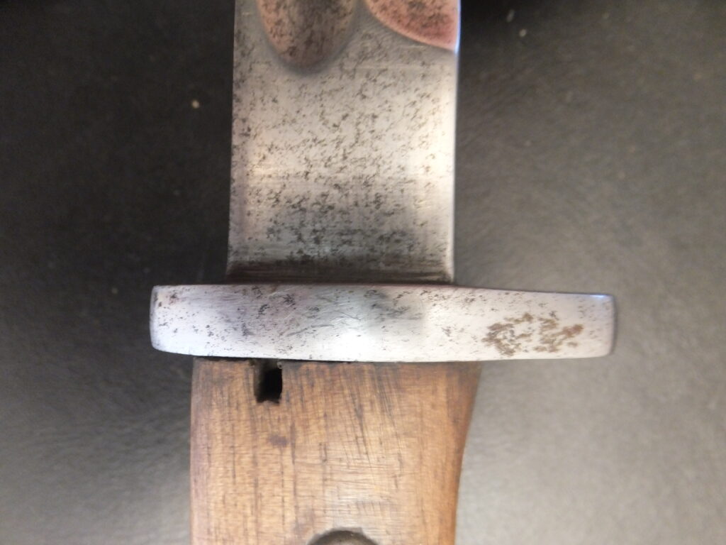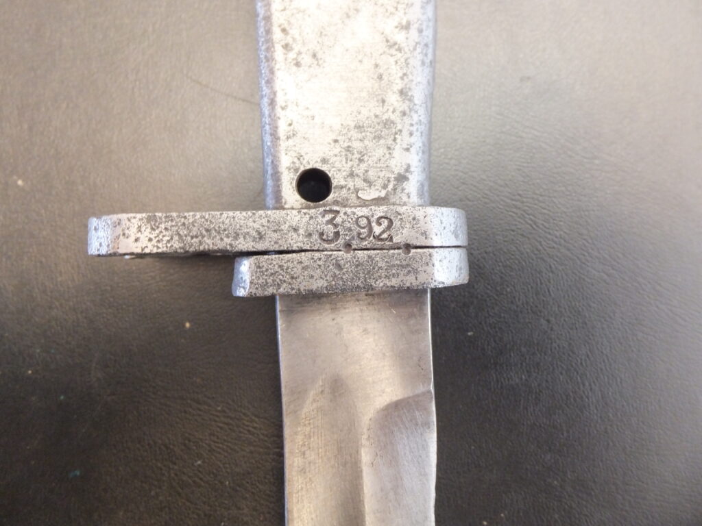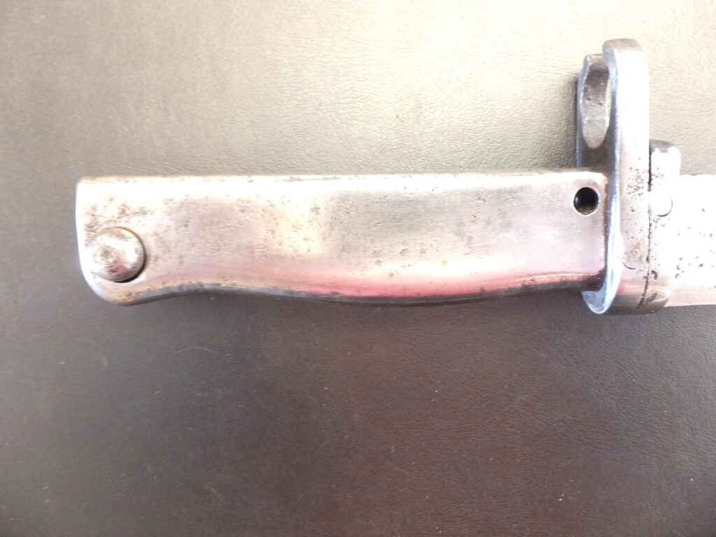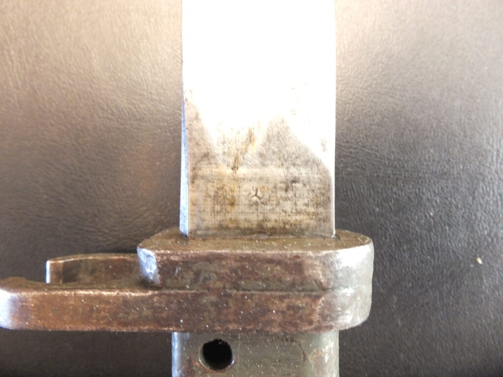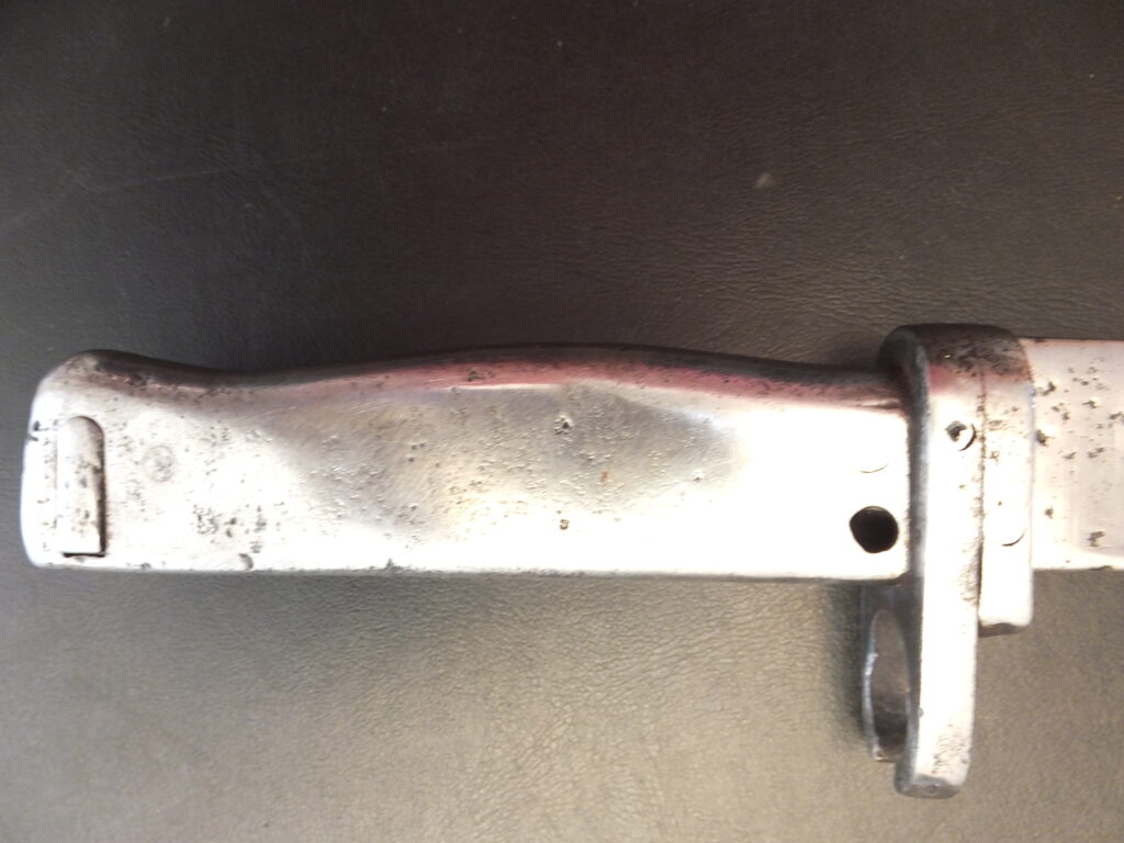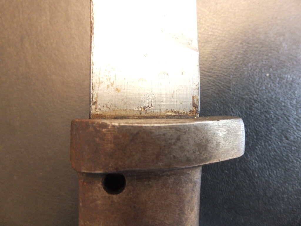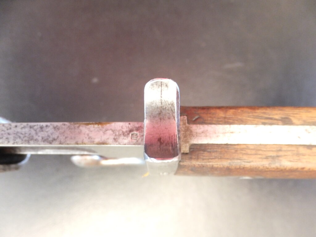 Il s’agit de la seule baïonnette de cette famille à posséder un orifice de nettoyage rectangulaire placé sur le dos de la poignée quasiment contre la croisière. La lame est ici à pan creux.