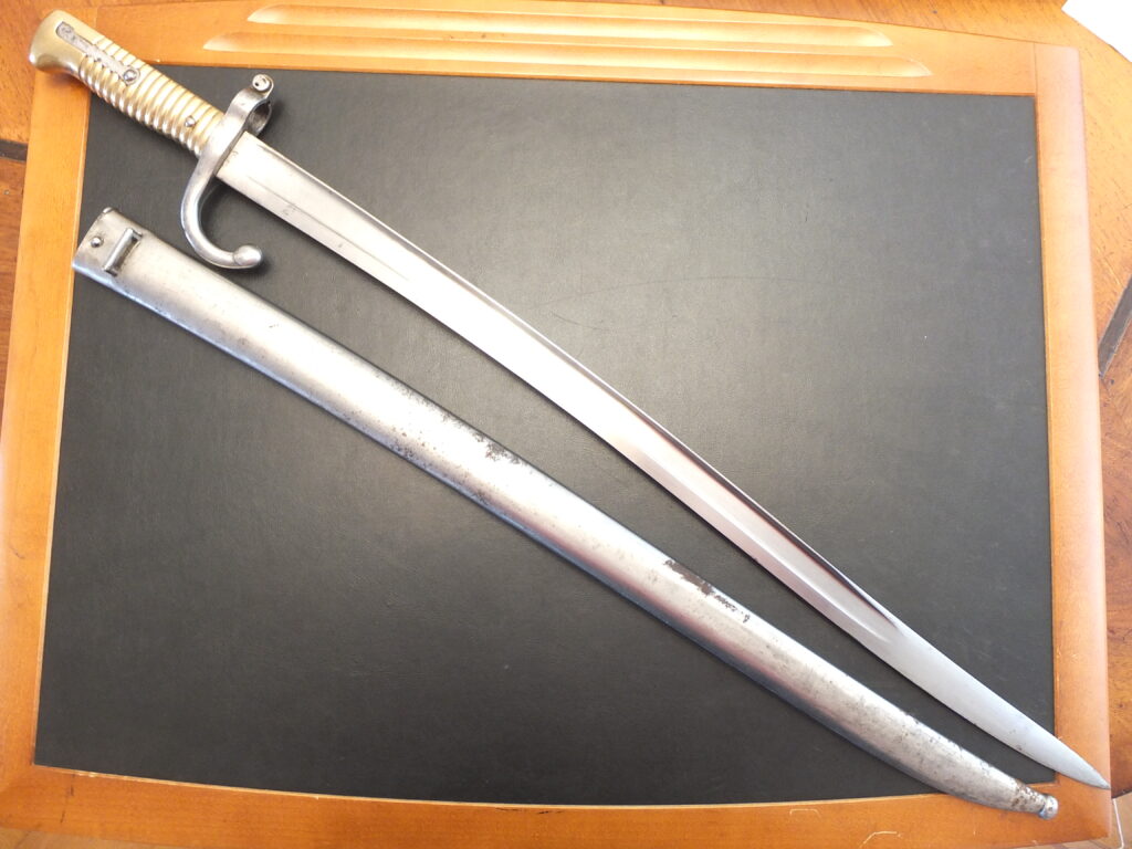 Baïonnette Ersatz EB61 lame française baïonnette gras 1874 marquage Manufacture d’Armes de Chatt juillet 1878 poinçon sur la poignée, marquage O1831 fourreau n° r54217