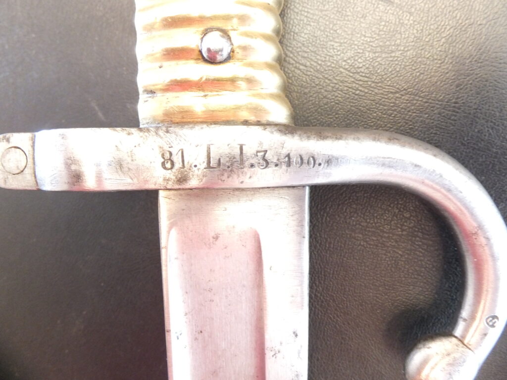 Ce remontage est sensiblement similaire au précédent mais d’un part le pommeau ne présente pas de marquage et également parla lame d’origine qui est issue d’un modèle 1870 type U ou Z., les autres modifications sont les mêmes