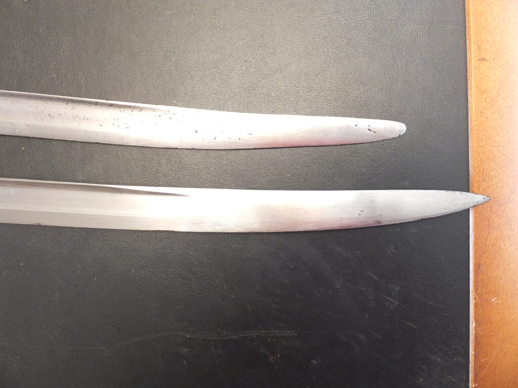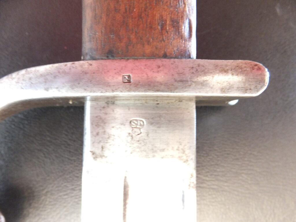 Baïonnette Allemande ersatz à partir d’une Baïonnette M 1903 du royaume de Siam (Thaïlande). W sur le dos de la lame, probablement pour Weyersberg & Kirschbaum.