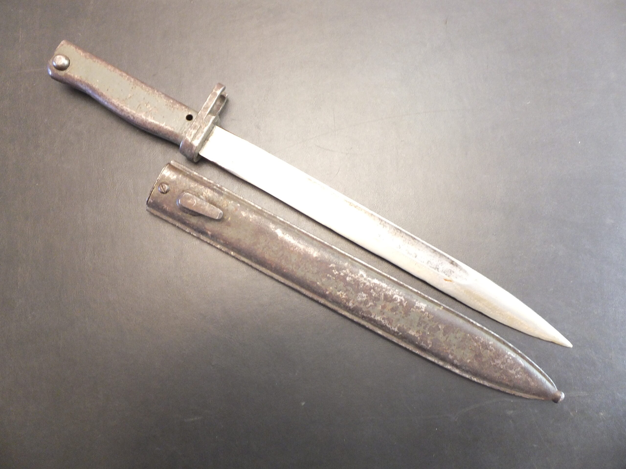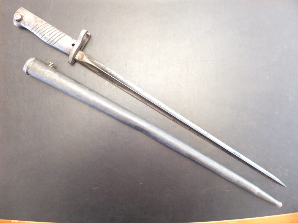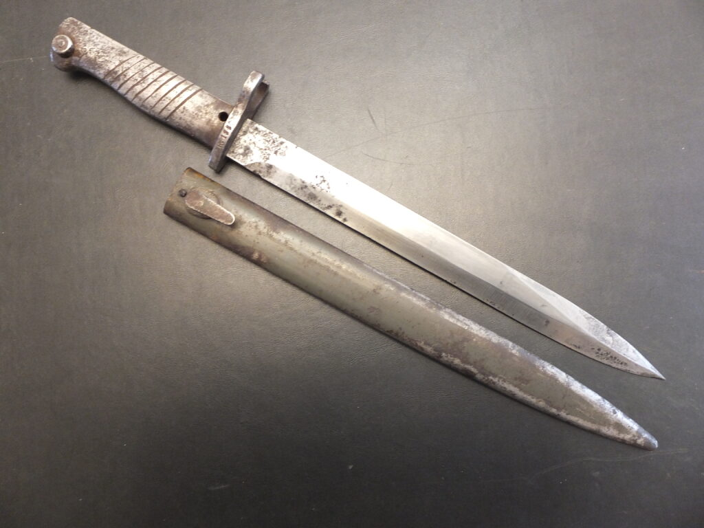 Baïonnette Allemande Ersatz à partir d’une baïonnette italienne M1870, le marquage italien est partiellement effacé (?157?1), le fourreau d’origine a été conservé (marquage Terni 1889)