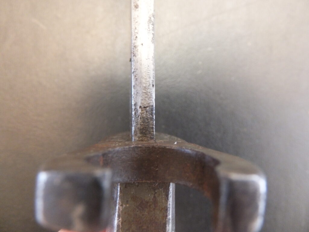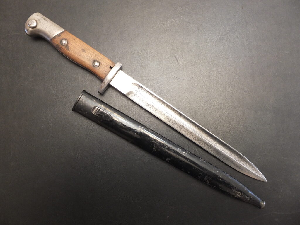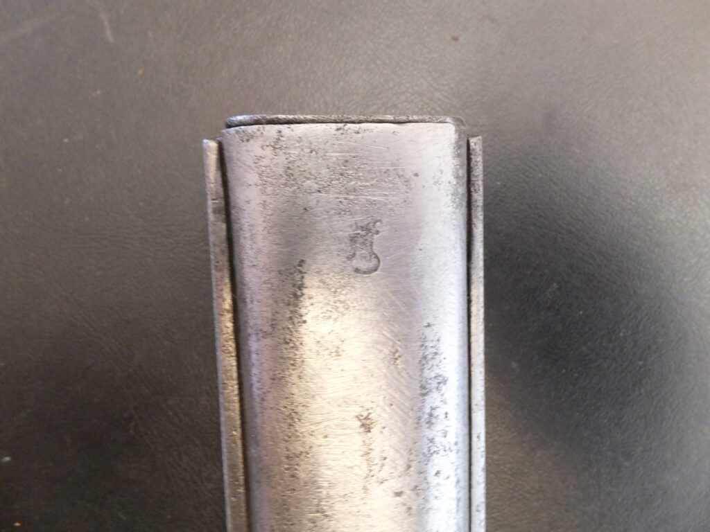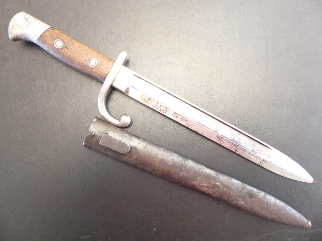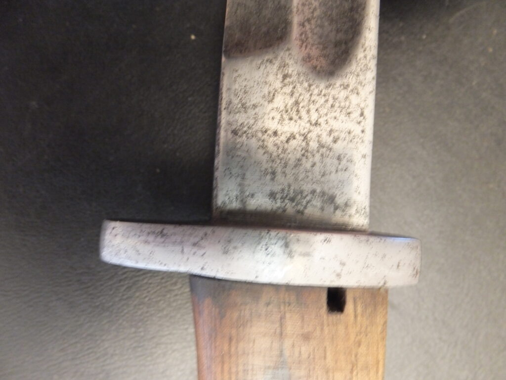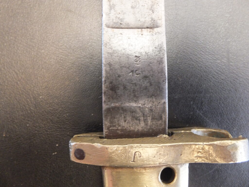 Cette baïonnette est assez paticulière car elle est visible dan sl’ouvrage de Roy Williams sous le numéro 805 mais nul part ailleurs. Elle est issue de la modificatin d’une sabre-baïonnette d’artillerie M1853 2eme modèle. La poignée présente un pommeau à bec, des plaquettes en cuir noir quadrillées maintnues par 4 rivets dont l’un traversant et à tête bombée tient le ressort plat. La rainure de fixation est en T avec un léger chanfrein qui a été très légèrement meulé. la croisière en acier comprenait initialement une bague au ras du dos qui a été entièrement meulée et arrondi jusqu’au niveau de la poignée alors que l’autre extrémité intacte comporte un quillon à rouleau plat tourné vers la lame. Cette dernière est de forme yatagan à tranchant et contre-tranchant sur 230mm, à pans creux sur chaque face, aux extrémités pointues de chaque côté. Le fourreau était initialement en acier poli blanc à méplat au dos très marqué. Il est ici remplacé par un fourreau de baïonnette francçaise modèle 1842 dont le bouton de chappe a été modfié par les allemands. Ces baïonnettes, inspirées du modèle francçias 1842, ont été fournis pas le commerce anglais et par Solingen dont elle porte la tête de roi sur la lame.