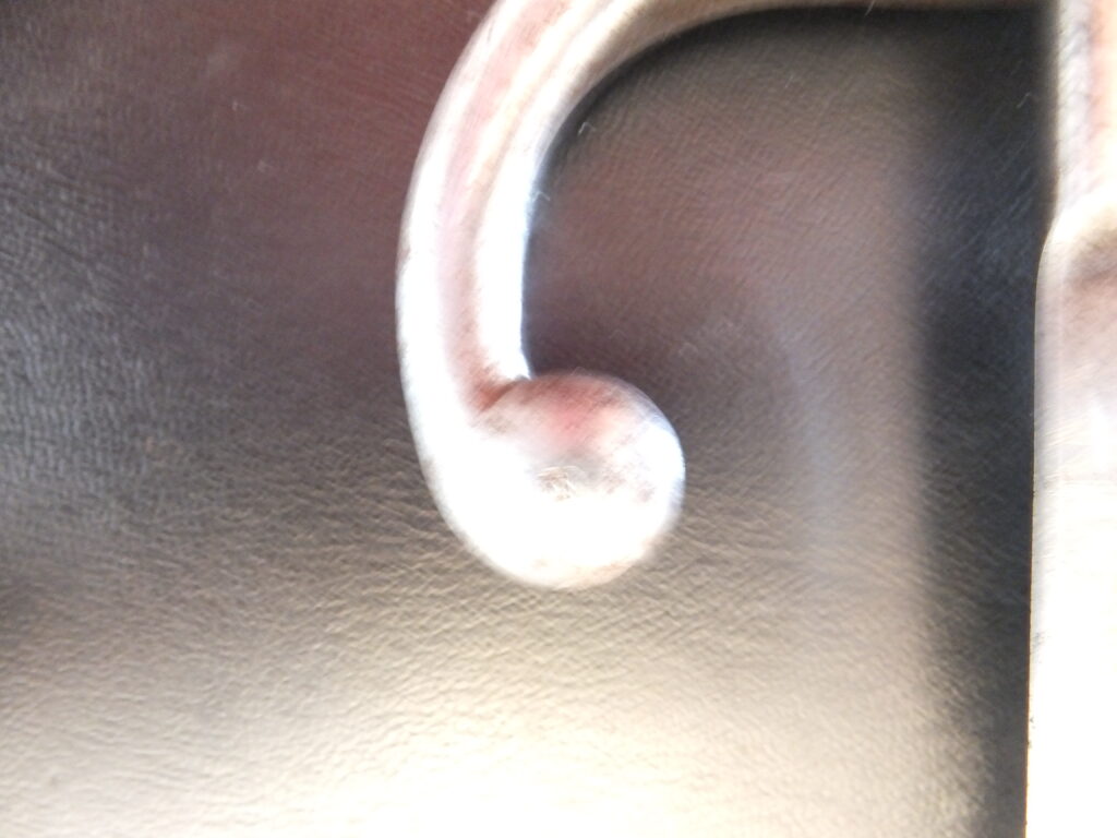 Cette variante des modèles précédents est la plus rare compte tenu de la complexité de la réalisation de l’usinage d’un pommeau de type S.98. Le pommeau en acier à bec à découpe en S sur les plaquettes présente une rainure de fixation en trèfle. Le bouton poussoir est à droite et le verrou est actionné par un ressort interne. Les plaquettes en bois sont tenues par deux vis à têtes sans fente à gauche et écrou à 2 encoches à droite. Elles présentent un petit trou de nettoyage sur chaque face. La croisière d’origine a été modifiée par suppression du quillon en arrondi à 10mm de la poignée et de la bague dont il subsiste un embryon de douille pour le passage du canon. La lame et le fourreau ont été conservés, ainsi que les marquages et poinçons français.