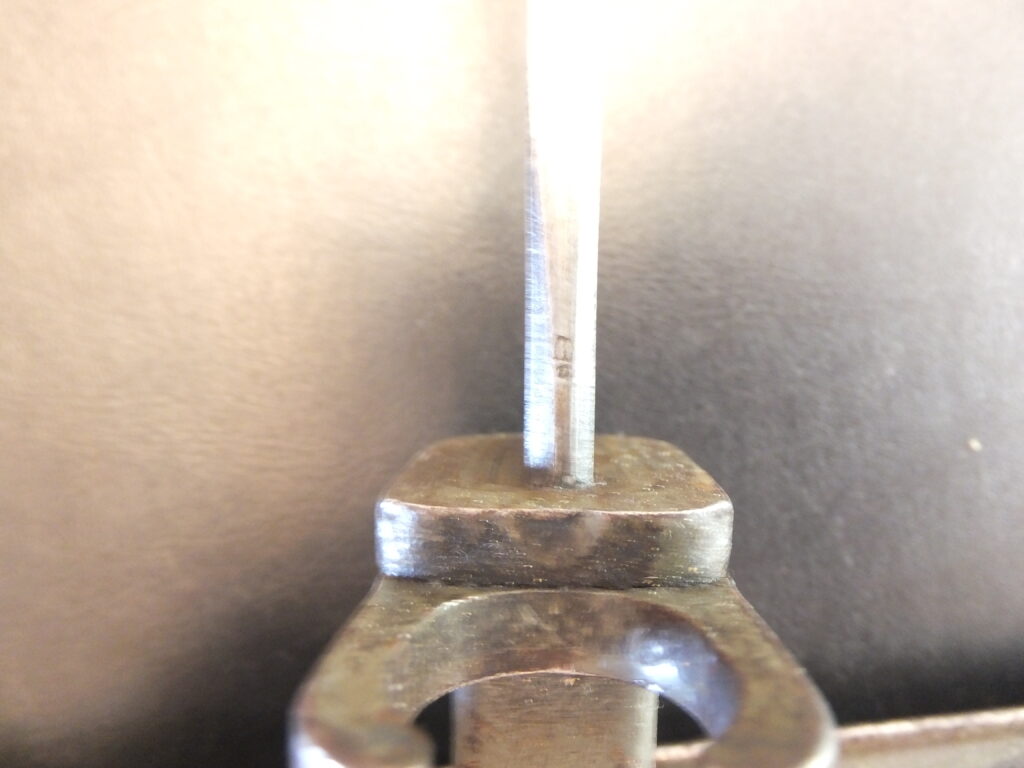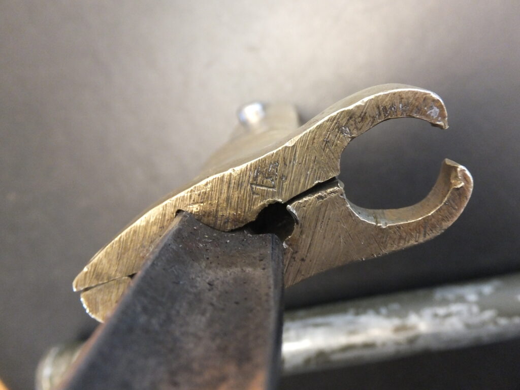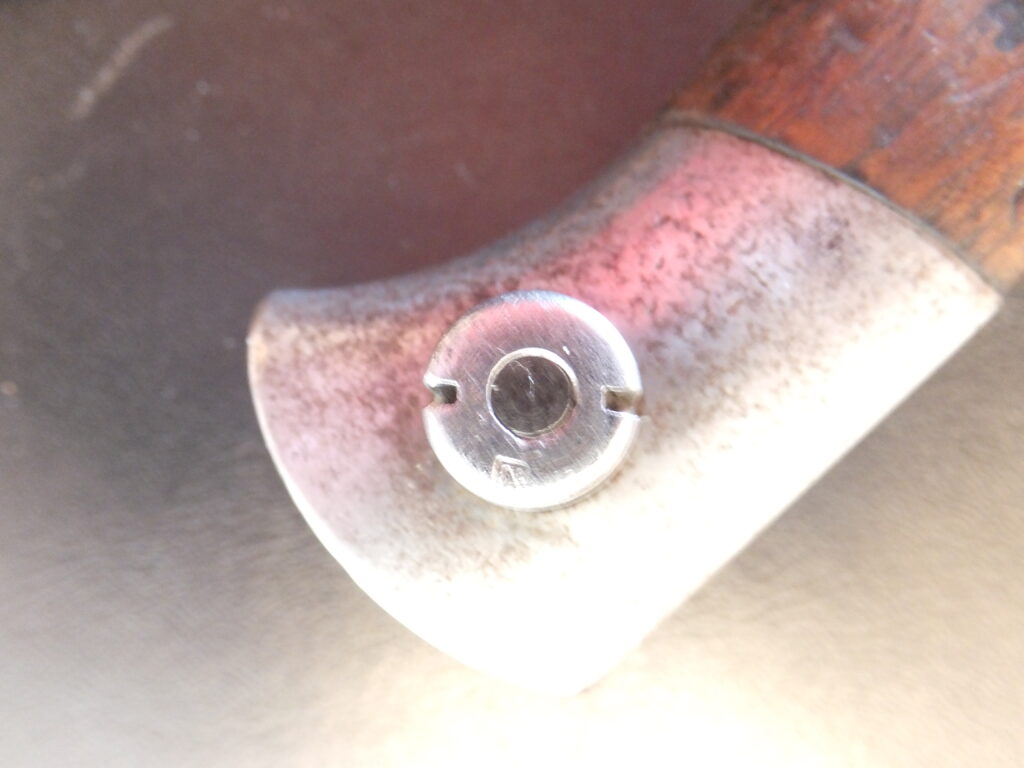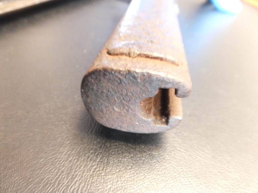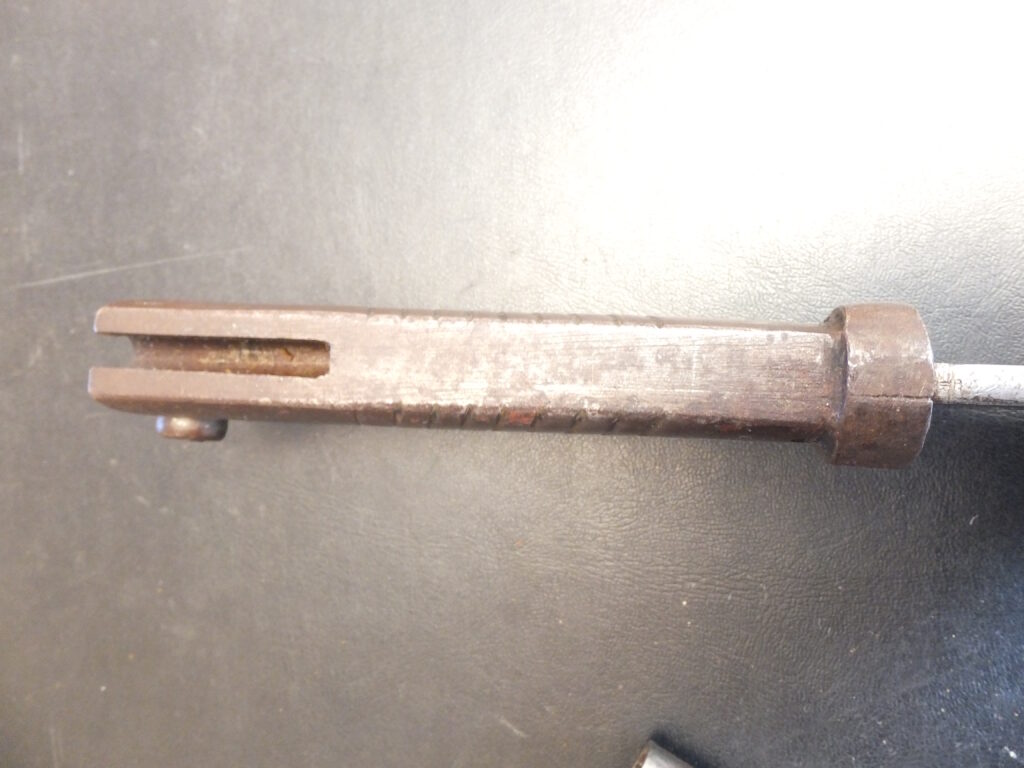 Ce sabre baïonnette turc M1887 a été modifié par les allemands pour une utilisation dans les transmissions. La douille de croisière a été bouchée par soudure et a été fixée une tige filetée sur laquelle se vissent 2 molettes en laiton qui servent à bloquer le fil d’un téléphone de campagne. Ce fil était relié à des observateurs dans des ballons captifs qui envoyaient ainsi les informations au poste de commandement. On ne trouve pas souvent cette modification et la majeur partie du temps, ces baïonnettes ont très abimées.