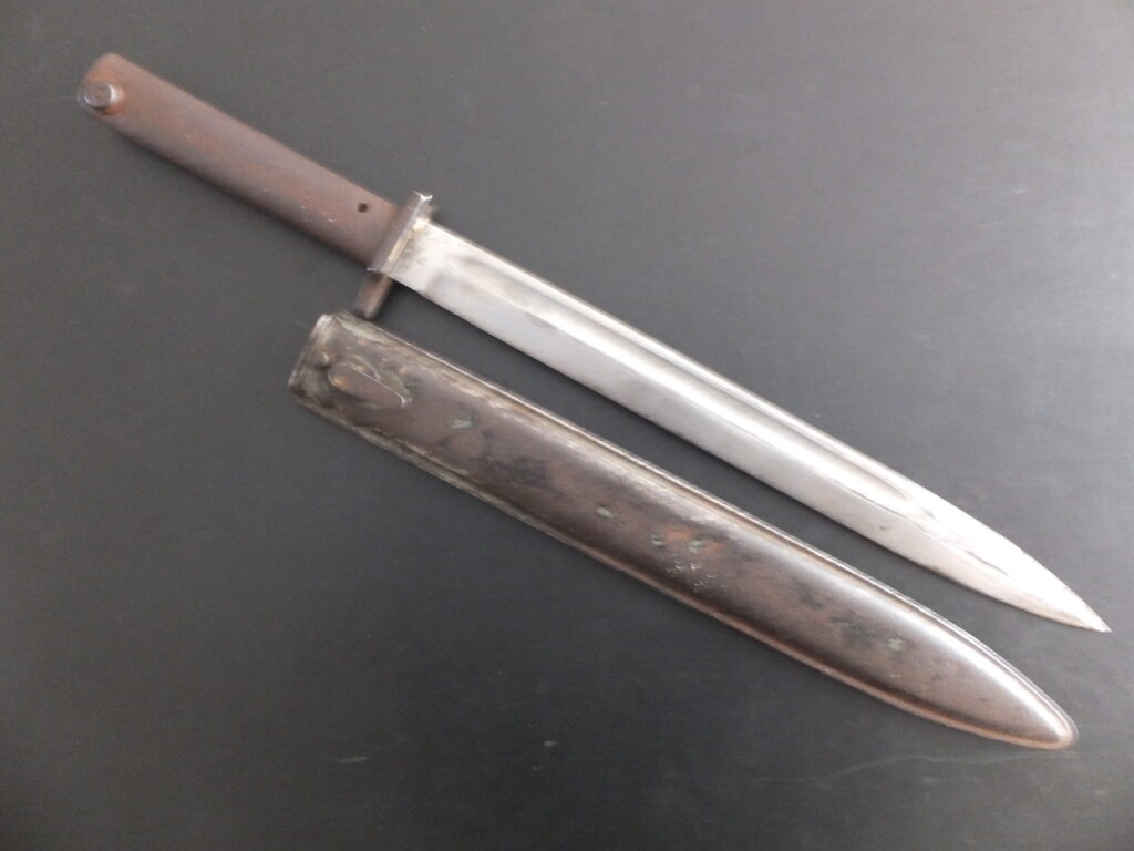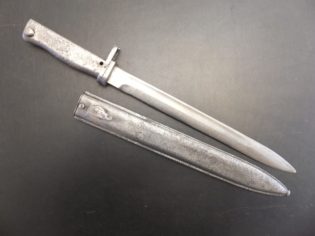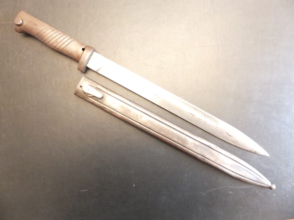 Baïonnette Allemande Ersatz à partir d’une baïonnette italienne M1870 type D, le marquage italien est effacé, le fourreau n’est pas le fourreau d’origine de ce type de modèle mais reste un modèle italien.