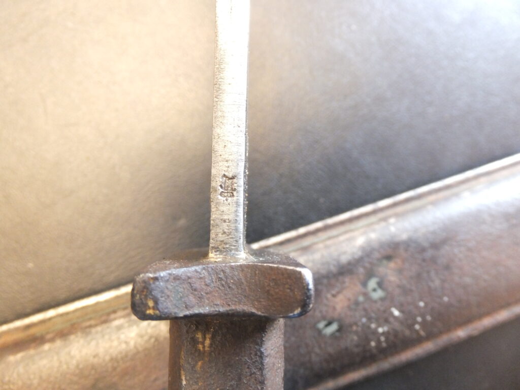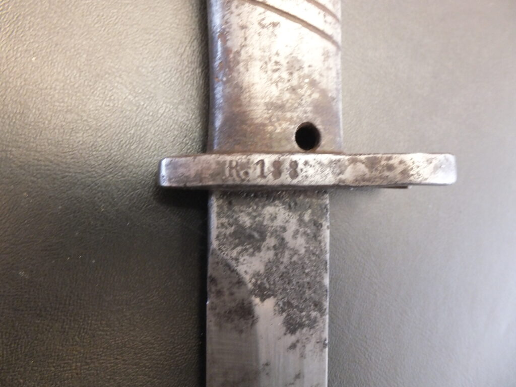 Baïonnette ersatz à partir du modèle Sabre-Baïonnette italien M 1870, le marquage d’origine sur la croisière est masqué par des X et l’autre côté est marqué E.B.R.R.66 (Ersatz-Bataillon Reserve-Infanterie -Regiment 66).