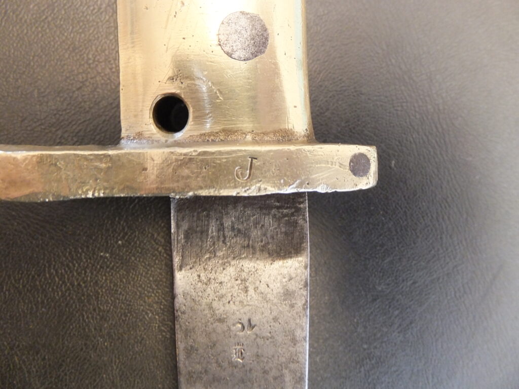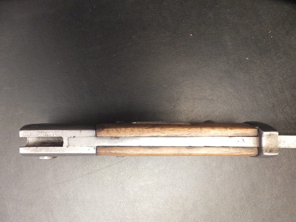 Cette baïonnette est une variante des précédentes mais plus courte, possiblement car la lame a été cassée lors de sa pliure manuelle et finalement adaptée pour ne pas la jeter. Dans ce cas, le fourreau a été adapté et un embout en laiton a été ajouté. Le pommeau porte ici l’inscription württemberg dans un cartouche associée ala ramure de scerf utilisée comme marque de propriété par ce royaume.