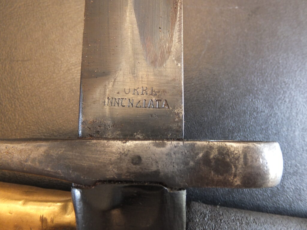 Baïonnette de chasseurs napolitain modèle 1850. Marquage 3B3C 98 pour 3eme bataillon, 3eme compagnie chasseur N° 98. C dans un cercle et 1855 au talon. Le fourreau est un fourreau de remplacement en acier, ressemblant à un fourreau français 1842 mais plus léger et avec des poinçons d’acceptations italiens (B et A). Le fourreau initial était un fourreau en cuir.