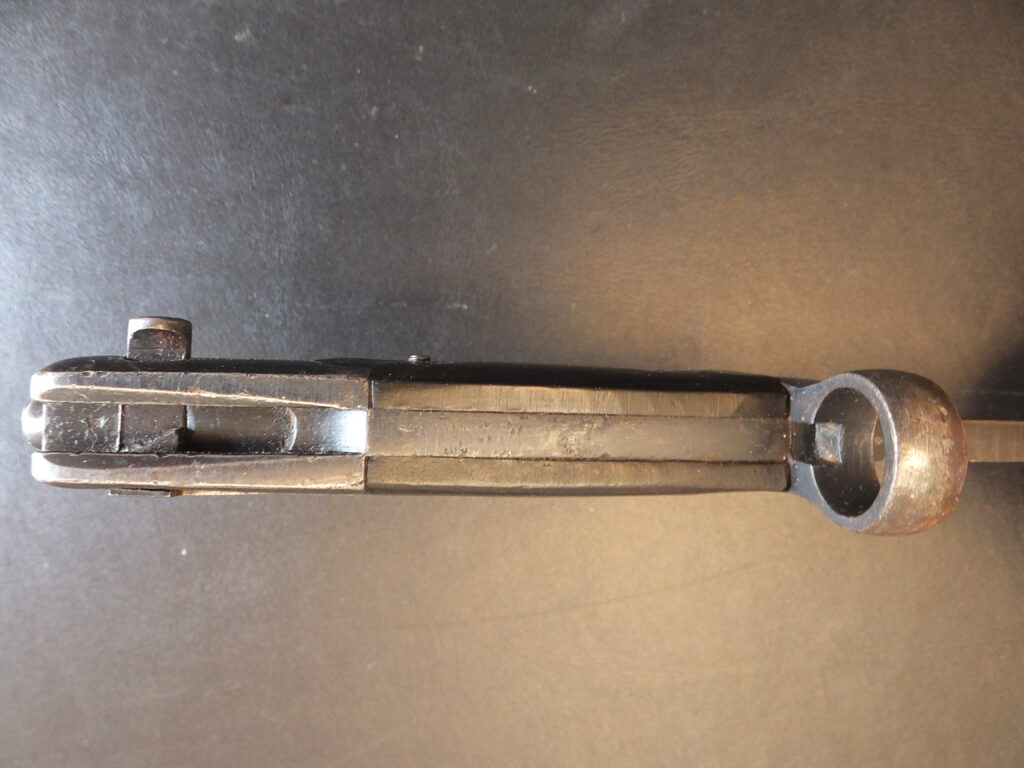 Cette baïonnette est construite fixe d’origine, c’est la version définitive de la série. Bien que l’aspect général reste similaire, la construction est différente. La soie sur le dos de la lame est bien plus mince, les vis sont remplacées par des rivets légèrement proéminents sur cuvette. La poignée est identique celle du modèle pliant, mais la gorge prévue pour le repli de la lame a été supprimée. La croisière a un profil plus simple et il n’y a plus de débordement de forme arrondi sur le bois de la poignée comme sur les modèles antérieurs. La soie apparait plus mince sur le dos de la poignée. La lame est celle du modèle pliant