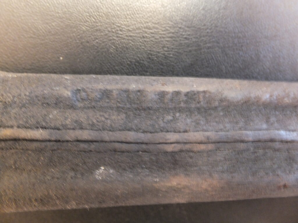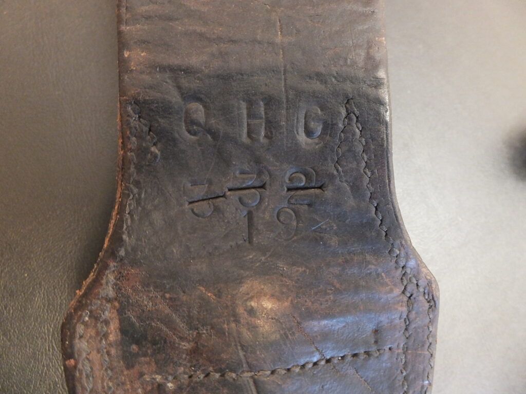 Le fourreau en cuir noir à garnitures en laiton courtes. La chape présente des bords parallèles et un bouton de suspension étroit, ovale, vissé sur l’embase. La bouterolle se découpe sur le cuir selon une courbe concave. Elle se termine en un arrondi assez large bordé d’un dard tout autour. Elle est fixée au cuir par 2 petits rivets sur chaque face. Le cuir présente de forts bourrelets au contact de la garniture et deux traits longitudinaux formant un bourrelet de chaque côté.