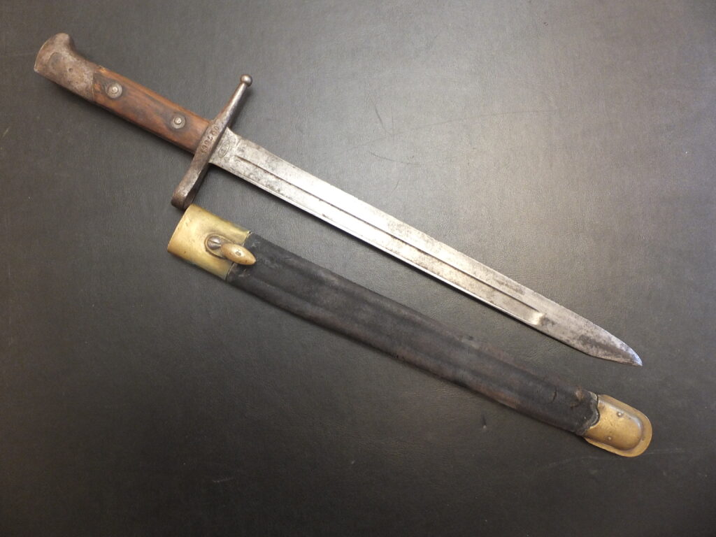 Cette baïonnette fût très longtemps utilisée car elle a accompagné son arme à feu d’origine à travers les différentes modifications qu’elle a subie. Elle fut initialement utilisée dans l’artillerie puis ensuite distribuée aux sapeurs. La poignée est en laiton cannelée, ne formant qu’une seule et unique pièce avec la croisière qui comporte deux petits quillons droits à extrémités renflées. Elle présente un pommeau asymétrique comportant un gros écrou ovale est vissé au talon. Un ressort latéral est monté sur une rainure de fixation en T de 56mm. La lame est droite, de section losangique à deux tranchants symétriques et à arête médiane.